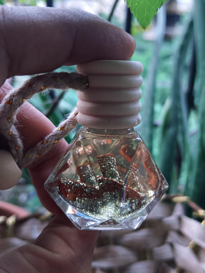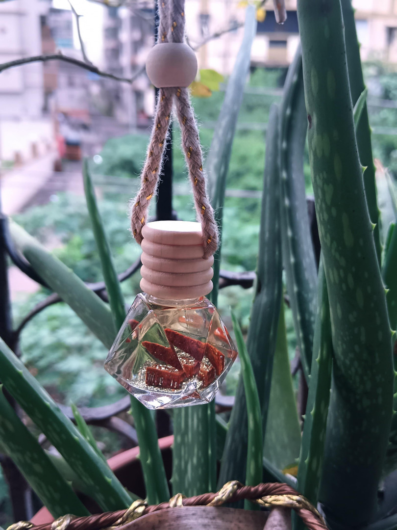 Transform your driving experience with the calming and warm scent of cinnamon. This elegant hanging car diffuser features a beautifully faceted glass bottle filled with essential oil and real cinnamon sticks, releasing a gentle fragrance that refreshes your car interior naturally.