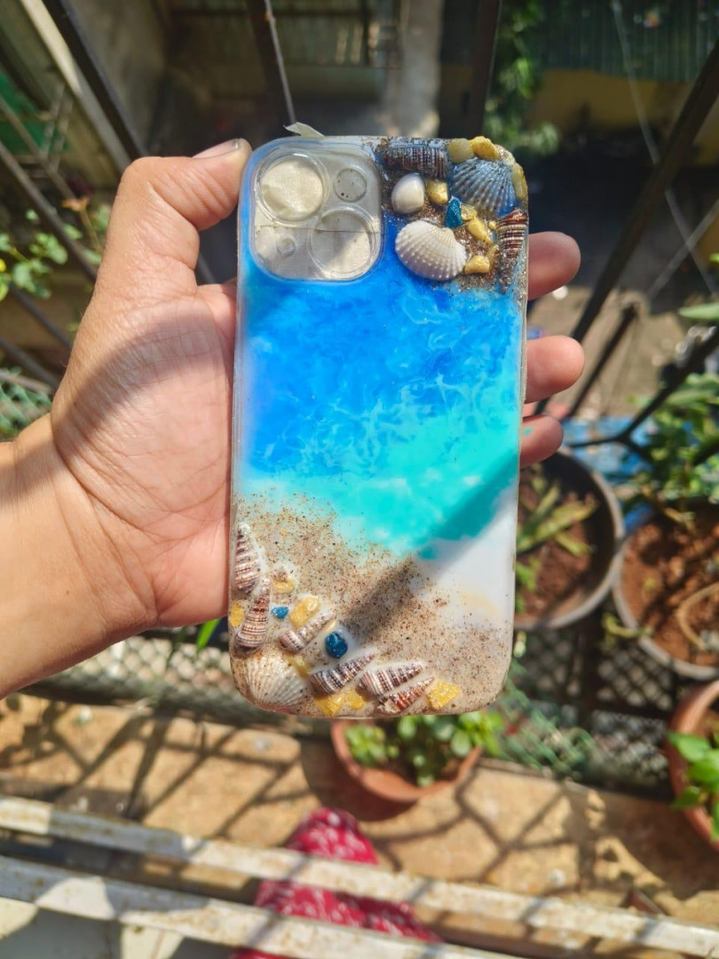 Carry the beach with you wherever you go! This handcrafted resin mobile cover features a stunning beach theme with real seashells, sand, and ocean-like resin art. Each piece is uniquely made by hand, giving it a one-of-a-kind tropical vibe and personal flair. Made with care and creativity, this case protects your phone while showcasing a miniature seascape. Perfect for beach lovers, coastal decor fans, and those who appreciate custom-made artistry.