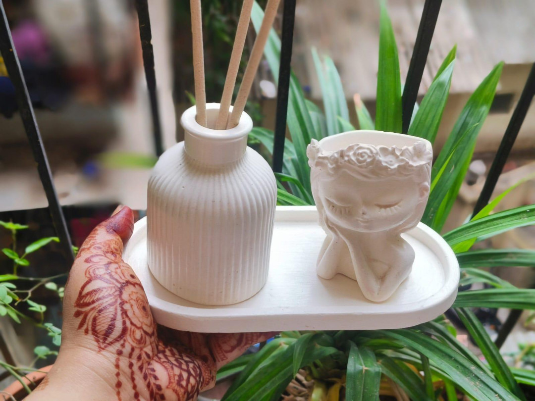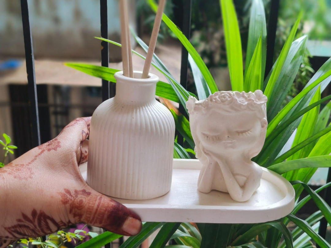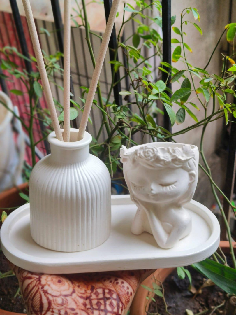 Transform your living space with this Elegant White Concrete Decor Set, a harmonious blend of simplicity and sophistication. Thoughtfully curated, the set includes a ribbed concrete vase—perfect as an incense stick holder, dried flower vase, or minimalist accent piece—and a delicate angelic-face planter, designed with a serene expression and floral crown that radiates peace and charm. Both items are beautifully placed on a sleek white tray that ties the entire look together.