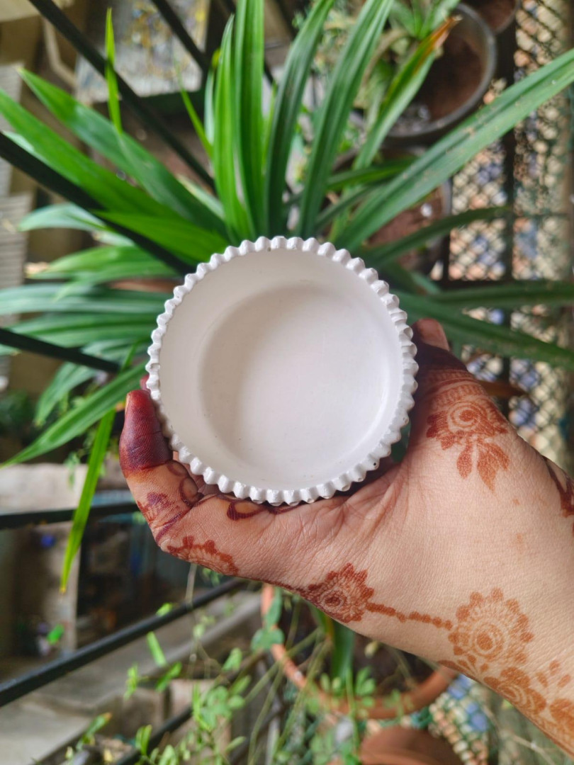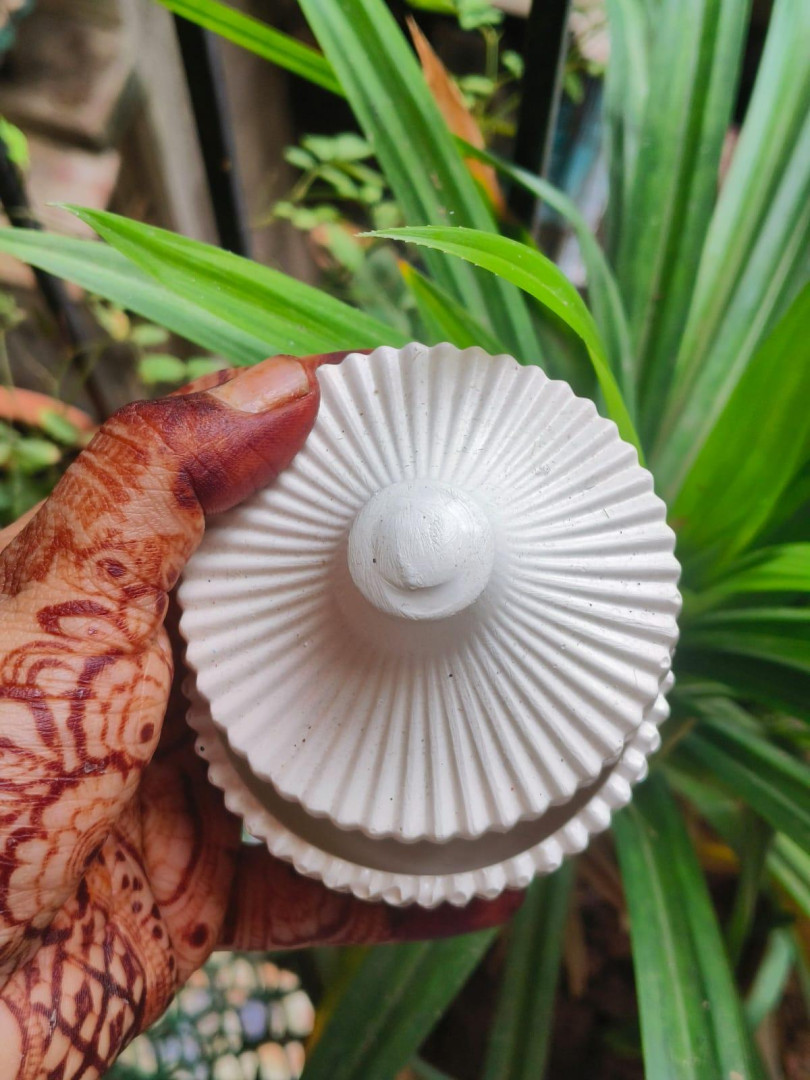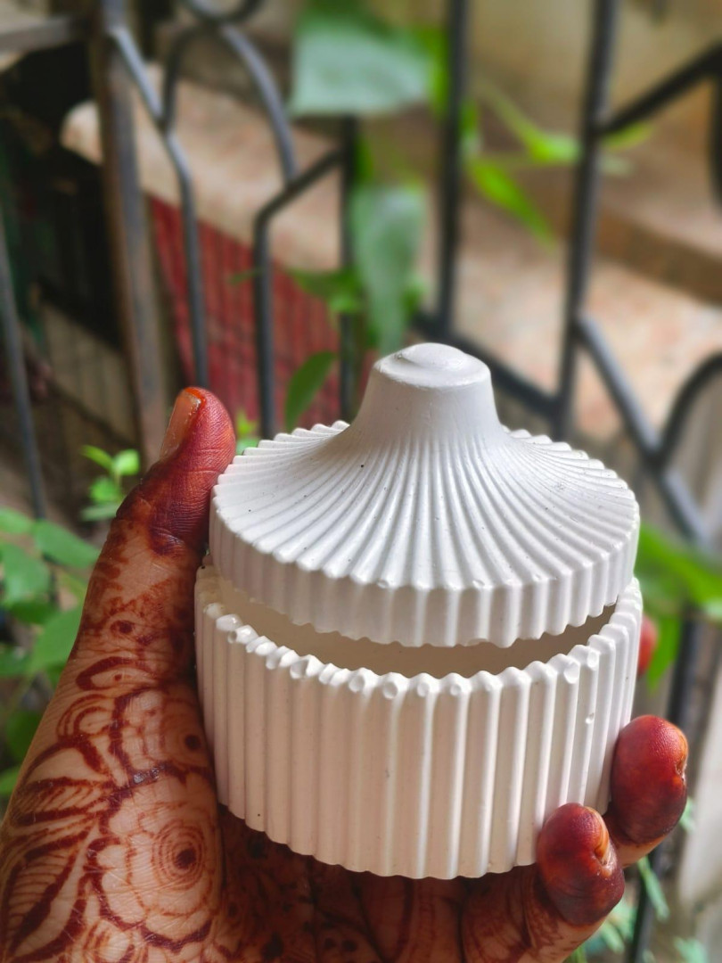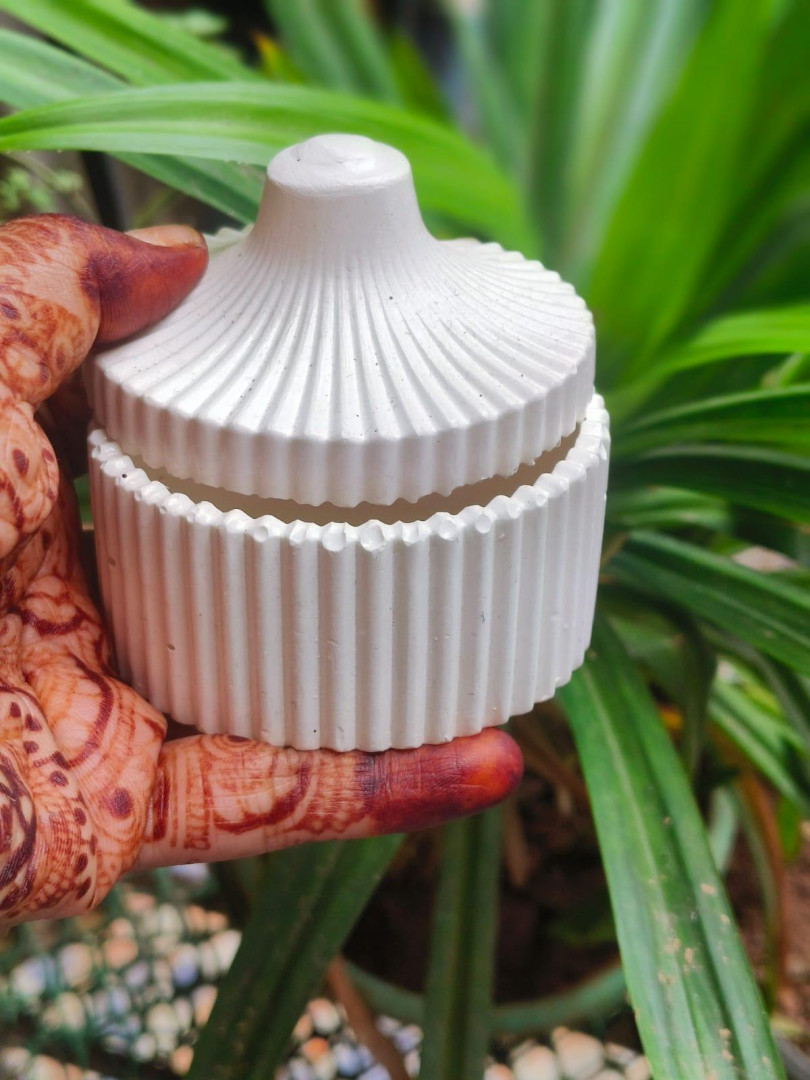 Add a touch of elegance and utility to your space with this beautifully handcrafted White Concrete Jar with Lid. Designed with a textured ribbed pattern and a smooth matte finish, this multi-purpose storage jar is perfect for storing jewelry, dry spices, cotton pads, or even incense cones. The sturdy build and secure lid make it both functional and decorative, suitable for use in your bathroom, vanity, kitchen, or pooja corner.
